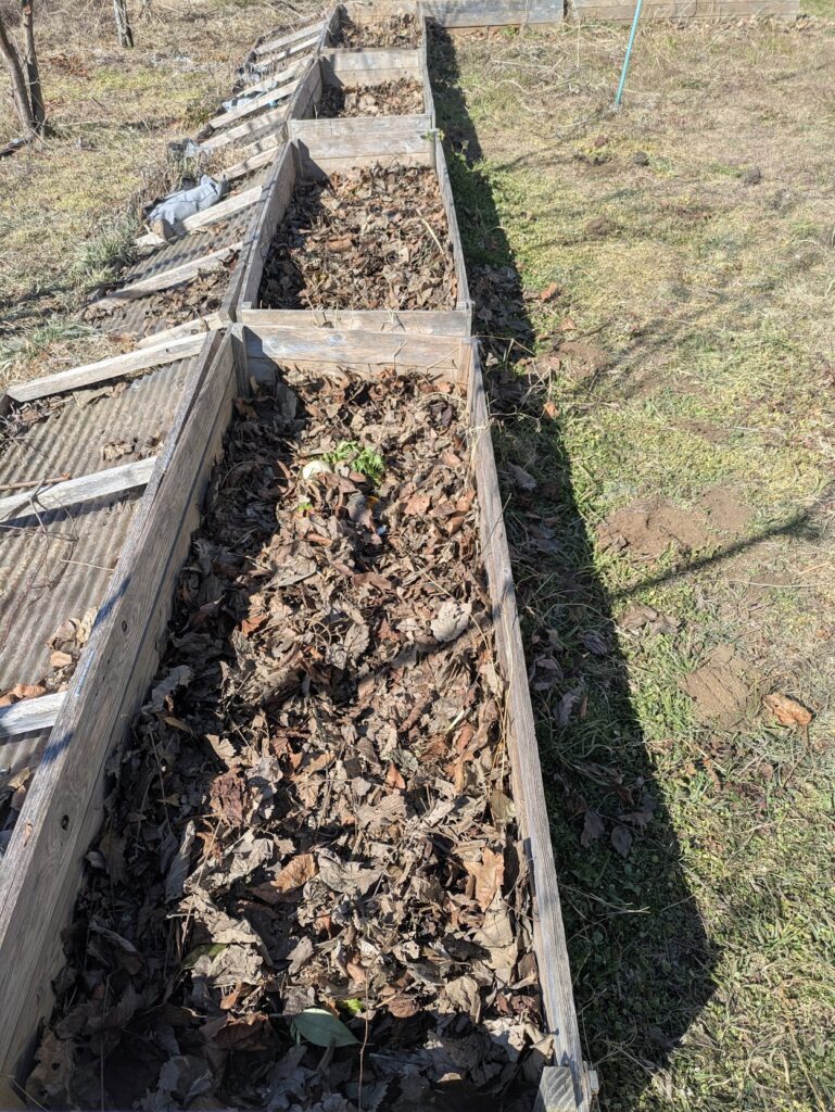 踏み込み温床の用意。一週間前に落ち葉を集めて、米の研ぎ汁を振りかけて、踏みつけて終了。